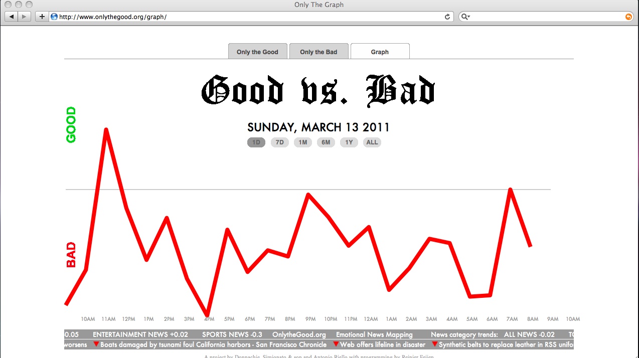 Das Web-Kunstprojekt „Only the Good/Bad“, der Künstler Karen Ann Donnachie, Antonio Riello und Andy Simionato setzt genau an diesem für die heutige Gesellschaft sensiblen und vielleicht auch bestimmenden Punkt an. „Only the Good/Bad“ ist eine emotionale News-Kartierungsmaschine. Sie klassifiziert die Schlagzeilen von Nachrichtenportalen im Internet wie GoogleNews, Reuter, BBC, oder der AssociatedPress nach emotionalen Gesichtspunkten in gute und schlechte Nachrichten. Die guten Nachrichten werden auf der Seite „Only the Good.org“, die schlechten auf „Only the Bad.org.“ in Realzeit gesammelt. Es ergeben sich zwei digitale Zeitschriften die laufende aktuell gehalten und mit neuen Nachrichten gespeist werden. Zusätzlich bietet „Only the Good/Bad“ einen Seismographen, welcher den emotionalen Stand der gesammelten Nachrichten als Grafik anzeigt. Es verwundert kaum die Tatsache, dass der überwiegende Teil der Informationen „Bad News“ sind und dennoch oder gerade deswegen bietet das Kunstprojekt eine große gesellschaftliche Chance: Es erlaubt den in der Informationsflut surfenden sich zu entscheiden, mit „Only the Good“ nur gute Nachrichten zu lesen. Es ereignet sich die von Neil Postman prophezeite „schöne neue Welt“, allerdings unter völlig anderen Prämissen als in „Wir amüsieren uns zu Tode“. Die digitale Reality des Internet ist nicht nur vom Unterhaltungswert des Fernsehen bestimmt sondern vor allem von einem Überangebot an Informationen die primär verarbeitet und eingeordnet werden müssen. Der einsamen Surfer vor dem Computer werden dabei vielfach von Horrornachrichten und einer weiten „Unterwelt“ an Gewalt, Sex, Katastrophe, Extremismus und Tod konfrontiert, die manchmal undurchdringlich scheint. Mit „Only the Good/Bad“ haben die Künstler eine Möglichkeit geschaffen une eine Rolle eingenommen, welche Künstler ehemals inne hatten und die ihnen im Laufe der Historie von den Massenmedien abgenommen worden ist. „Only the Good/Bad“ kann das Gefühl der Gesellschaft beeinflussen und zeigt entweder die guten oder die schlechte Nachrichten, je nachdem wie es den mediengewohnten Rezipienten vor dem privaten Laptop, im Büro oder im Internetcafé beliebt. Die Kunst ist dorthin gelangt wo die Gesellschaft sich aufhält und mischt sich genau dort, im digitalen Netz ein.