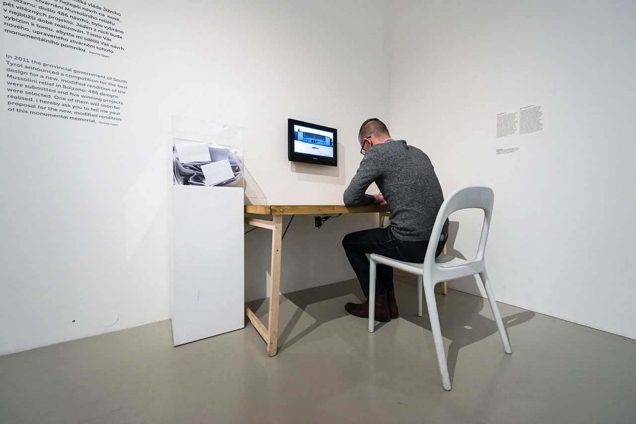 The Mussolini Relief in Bolzano is the largest still-intact fascist monument in Italy and in 2011 the South Tyrol Provincial Government organized a competition in mitiga123 tion of the relevance of this structure in the context of a modern, multi-cultural South Tyrol. Of the 486 entries, five emerged as clear winners with one of them soon to be implemented. In his work Relief (2014), Hannes Egger widens out the theme beyond the confines of South Tyrol. Participants from abroad are invited to reflect on the question of democratic fragility and to submit their own responses to the monument. Egger intentionally takes local Tyrolean historical and social issues out into a broader international context.