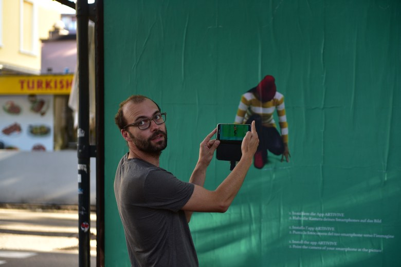 Hannes Egger conceived “We can Dance” for the project “KOPFhoch” by KUNST MERAN/Meranoarte. It is an augmented reality work. By using the Smartphone the person on the poster starts to dance.