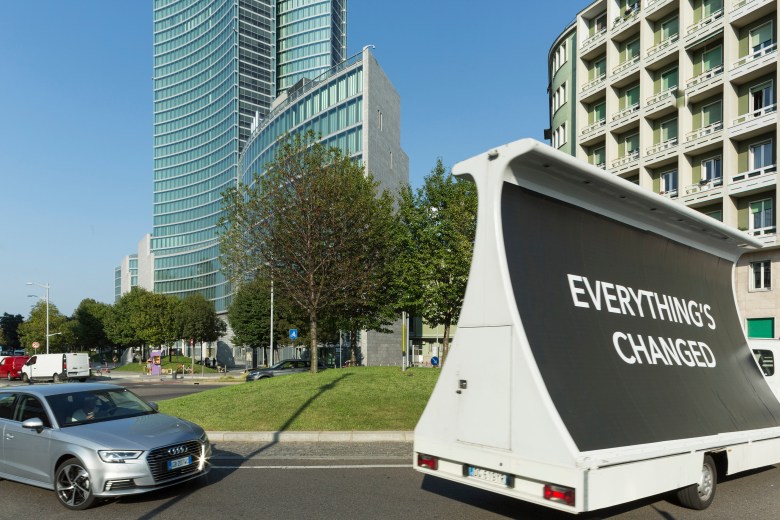 The exhibition that Italian artist Hannes Egger has prepared for the House of Arts in Ústí nad Labem refers in its title to a performance he realized in September this year in Milan. As part of that event, a rented billboard car drove round and round bearing a simple message: Everything’s Changed — Nothing’s Changed. At the heart of the region heavily affected by the coronavirus crisis, Hannes Egger drew attention to dramatic shifts in the functioning of society in response to the pandemic and at the same time offered hope, determination to face this unusual situation with respect for each individual destiny and ethical relations within a complex society.