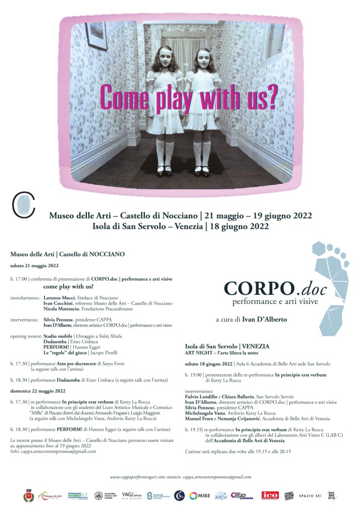 Con come play with us?CORPO.doc | performance e arti visive vuole offrire al suo pubblico delle proposte performative che, attraverso le “logiche del gioco”, si muovono tra realtà vissuta, memoria storica, eredità progettuale e re-performance.